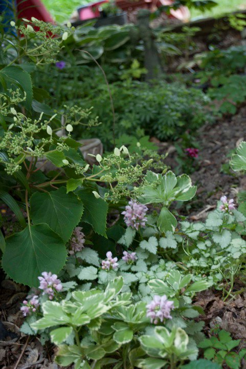 When planning it, I felt it seemed a central, eye catching element, as well as something tall. On one of my plant shopping trips, I fell in love with a Japanese Climbing Hydrangea and had to have it. This became the focal point in the center with a pyramid trellis. Then I built up and stair-stepped heights towards it from the outside in. I kept the pachysandra in places which is nice ground cover to fill in holes, (which it actually did once I ripped out all the landscape liner! This ground cover needs to extend roots in dirt, so landscape liner was preventing it from spreading properly). You can use different ground cover if you wish. Also, you have the flexibility to add different annuals here and there. Annuals help give color throughout the growing season, because though shade perennials are lovely, the blooms are generally short lived.
