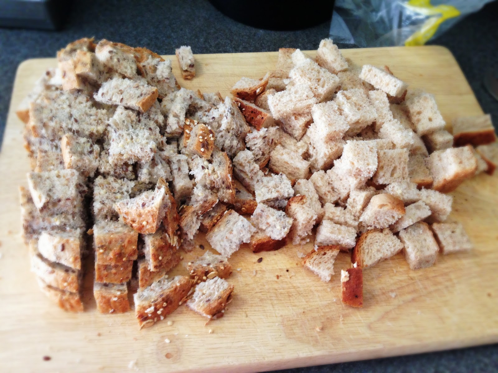 1/2 lb. dried out multi-grain bread, cubed